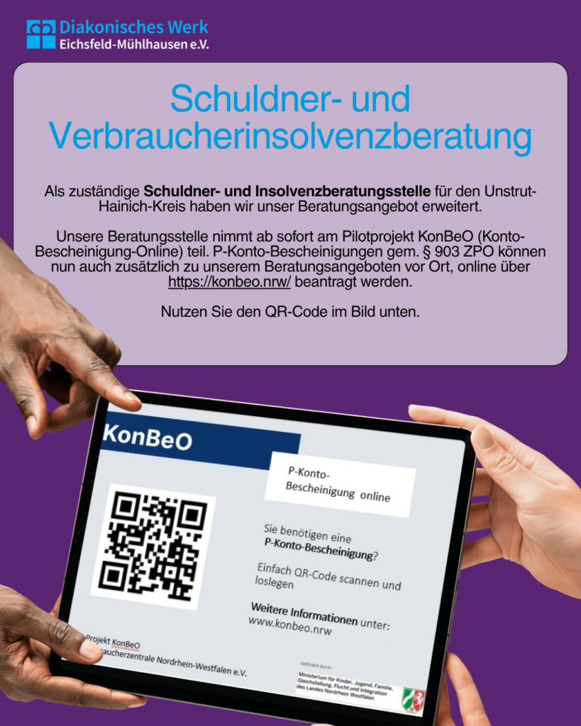 Unser Beratungsangebot wurde erweitert: Als Schuldner- und Verbraucherinsolvenzberatungsstelle für den Unstrut-Hainich-Kreis nehmen wir ab sofort am Pilotprojekt KonBeO teil. P-Konto-Bescheinigungen gemäß § 903 ZPO können damit nun zusätzlich auch online beantragt werden.